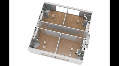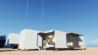 其实,这个模块化房屋就是大大小小的集装箱。而集装箱内所有的内部配件和固定装置都会预先安装,更重要的是这个模块化系统是可逆的,这就意味着它同样可以通过折叠回单元箱之后移动位置。